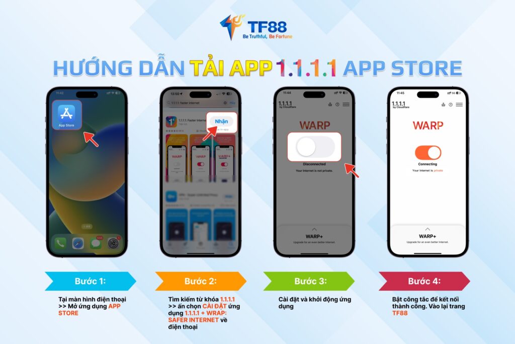 Vui lòng truy cập App Store hoặc CH Play để tải ứng dụng 1.1.1.1 được phát triển bởi công ty Cloudflare, Hoa Kỳ hay còn được biết đến tới với tên WARP giúp bạn thay đổi DNS, địa chỉ IP và dễ dàng truy cập vào các trang web bị chặn bởi nhà mạng, hoàn toàn miễn phí và bảo mật thông tin người chơi tuyệt tối. Vui lòng làm theo hướng dẫn.